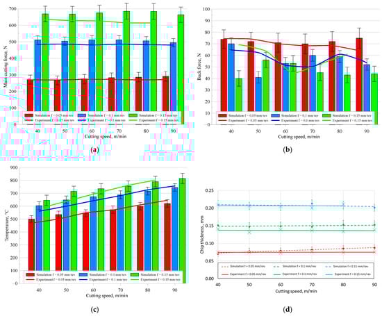 Comparison of simulation and experimental results for (a) main cutting force, (b) back cutting force, (c) cutting zone temperature, and (d) chip thickness.