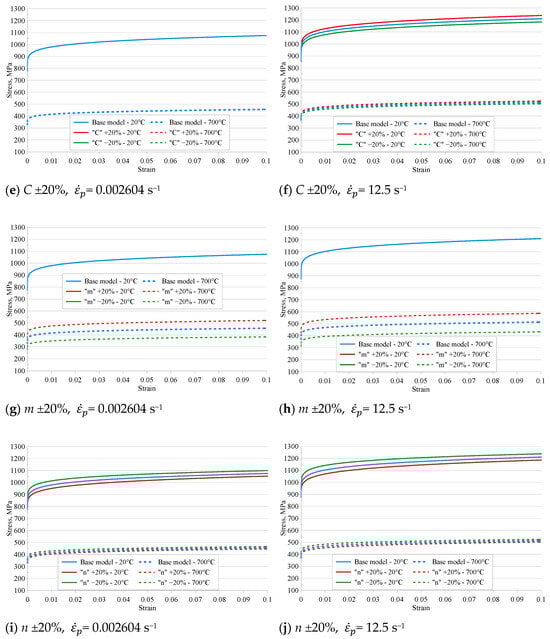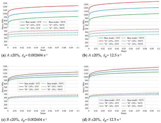 Parameter B, which governs strain hardening, exhibited a lesser influence on the stress–strain curve. As the strain increased, the differences between the baseline and modified models became more pronounced. The maximum difference observed within the tested parameter range was ±60 MPa (±5.6%) at a strain of 0.1 and 20 °C, and ±29 MPa (±5.6%) at 700 °C under low-strain-rate conditions. Comparable differences were observed at higher strain rates, where the maximum difference increased to ±68 MPa (±5.6%), while for 700 °C the same level of relative strain change (±5.6%) was maintained. The influence of parameter B becomes more pronounced at higher strain rates, where the material undergoes intense hardening.
