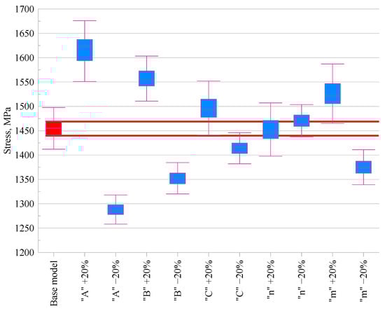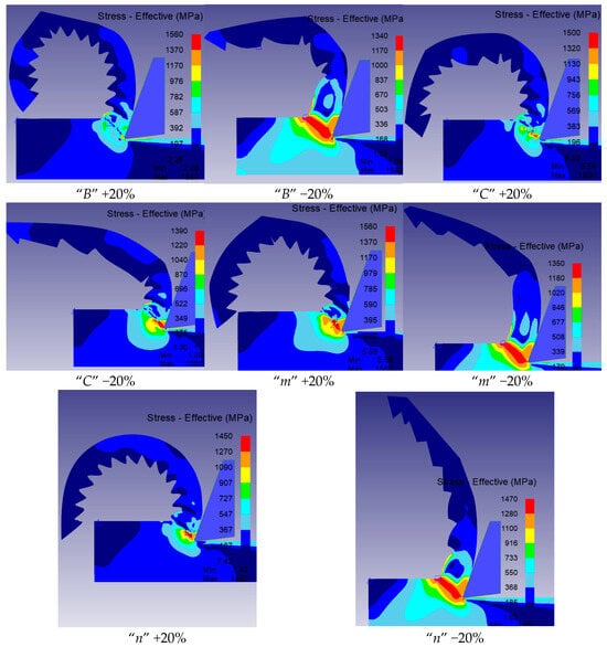 The effect of changing the values of the material constants in the Johnson–Cook constitutive model was also assessed in relation to the stresses in the material. Figure 8 showed the impact of modifying individual constants on the stress results obtained.