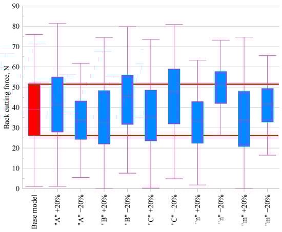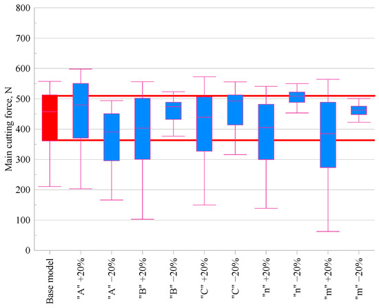 In order to compare the effect of changing individual parameters of the Johnson–Cook model, the variations in the main cutting force (Fc) and back force (Fp) were evaluated relative to the base model. Figure 5 and Figure 6 present the results in the form of box plots.