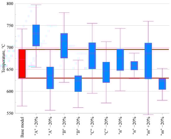 In the next stage of the analysis, the effect of changes in the Johnson–Cook model parameters on the temperature in the cutting zone was evaluated. Figure 7 presents the results of the FEM simulations, enabling a comparison of temperature values obtained for the base model and for variants in which the parameter values were altered by ±20%.