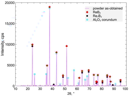 The XRD phase composition of the ReB2 + Al2O3 powder measurements is presented in Figure 1.