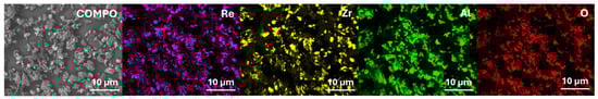 ReB2 has a very high melting point, about 2400 °C, and a very low self-diffusion coefficient [36]. The coatings are characterized by the porosity typical of APS coatings. Voids are visible in Figure 6. The larger amount of ReB2 particles accumulates at the bottom of the coating (green spots in Figure 6), although single unmelted particles are also visible on the surface. Pores occur in contact with the particles. The reason for the accumulation of pores near ReB2 may be the large unmelted ReB2 particles falling to the Al2O3-ZrO2 coating bottom (due to their high density).