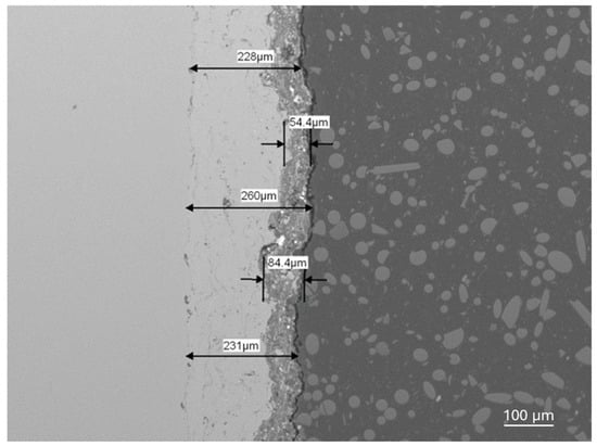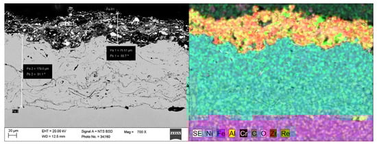 SEM and EDS microstructural examination of the cross-section of coating number 5 is presented in Figure 6 and Figure 7.