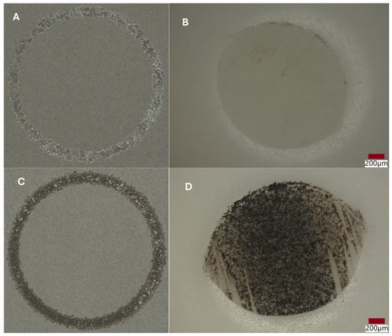 Wear tracks of abrasions on the coatings and counter samples (balls), examined using an optical microscope after tribological tests: (A,B) coating no. 4; (C,D) coating no. 5.
