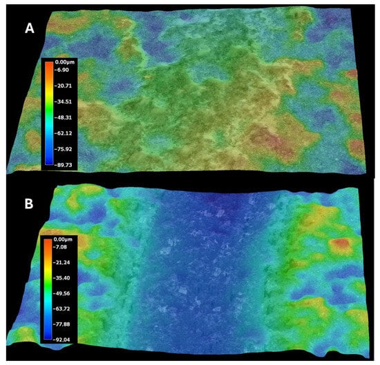 Figure 9A,B presents the profiles for the wear tracks of sample no. 5 after the ball-on-disk dry tests with the Al2O3 counterpart.