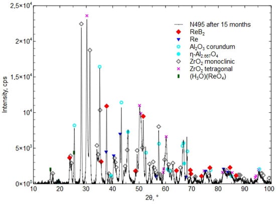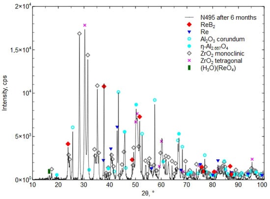 After 6 and 15 months, the coating was found to contain the hydronium rhenium oxide (H3O)(ReO4) [04-012-4121], which indicates a reaction with water. The presence of the boric acid H3BO3 phase was not detected, which indicates its small amount, below the detection limit of the XRD method (less than 2%).