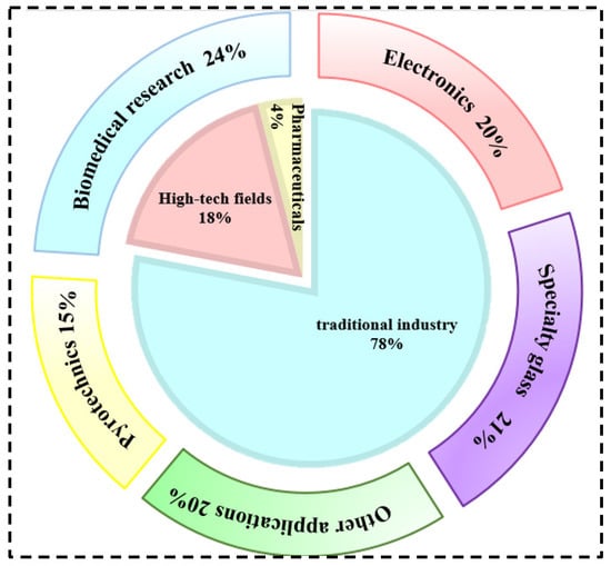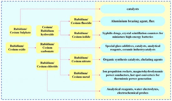 Rubidium and cesium are elements in the same main group. Their physical and chemical properties and atomic radii are similar. Therefore, in many industrial applications, rubidium and cesium can be substituted for each other. However, rubidium often occurs associated with lithium and cesium deposits, and there are few independent deposits. It is more difficult to obtain than cesium [1,3,8]. Therefore, cesium has a wider range of applications. Currently, rubidium and cesium products in the market are mainly supplied in the form of rubidium/cesium salts. Among them, (Rb)2CO3, (Cs)2CO3 [9] as well as CsOH and RbOH are the most widely used in the industry, as shown in Figure 1. About 78 per cent of rubidium and cesium resources in the global market are used in the preparation of traditional products such as electronics, special glass and biomedical products. With the continuous advancement of scientific and technological innovation, the applications of rubidium and cesium in high-tech products such as atomic clocks, magnetohydrodynamic generators and ion thrusters have gradually expanded. They already account for 18% of the total and the demand is increasing year by year, as shown in Figure 2. Rubidium and cesium are transitioning from traditional industrial raw materials to strategic resources. With the continuous expansion of the rubidium and cesium market, they have gradually become high-consumption resources.