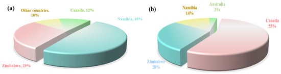 The globally extractable rubidium and cesium resources are highly concentrated. According to data released by the United States Geological Survey, the proven reserves of rubidium oxide and cesium oxide globally (excluding China) are 102,000 tons and 220,000 tons, respectively. These resources are mainly distributed in four countries: Canada, Zimbabwe, Namibia and Australia. The specific distribution is shown in Figure 4. China is rich in rubidium and cesium resources, with its reserves ranking among the highest in the world. These resources are mainly stored in Jiangxi, Hunan, Xinjiang, Qinghai and other places. In places such as Qinghai and Tibet, rubidium and cesium are mainly distributed in the form of brine in salt lakes and geothermal water. However, due to their low content, they mainly exist in the form of chemical compounds and coexist with elements in the same main group that have similar chemical properties (such as lithium, sodium, etc.). Therefore, they currently do not have the value of independent development and utilization. In places such as Jiangxi, rubidium and cesium mainly exist in the form of rubidium oxide and cesium oxide in extractable solid ores. Cumulative hard rock cesium resources in China’s major mining areas hold 68,000 tonnes and 55% of rubidium resources are in Jiangxi pegmatite ores, the vast majority of which are endowed in lithium ores in the form associated [6,12]. Limited by technology, in the industrial field rubidium and cesium are often treated as by-products of lithium ores, which causes a certain amount of waste of rubidium and cesium resources. Therefore, there is an urgent need to develop new extraction technologies for rubidium and cesium to increase their production, meet market demands, and support the global transformation of science and technology.