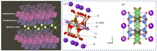 The color of lepidolite minerals ranges from purple to colorless. They have a pearly luster and stable chemical properties. Lepidolite crystals belong to the monoclinic crystal system and often appear as fine scaly aggregates. The T-O-T-type crystal structure composed of silicon–oxygen tetrahedrons (T) and aluminum–oxygen octahedrons (O) [13] is shown in Figure 5. Al3+, Fe2+ and Mg2+ mainly occupy the octahedral positions in the crystal lattice. Alkali metal cations such as K+, Na+ and Cs+ fill between the unit layers [18,19]. Cations such as Si4+ and Al3+ mainly occupy the tetrahedral positions in the lattice structure, forming a stable 2:1 type structure [20,21].