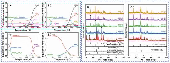 (a) Thermodynamic models, (b) K, Al, S, (c) Rb, and (d) Fe and phase changes (e,f) of each component of lepidolite in different reactions with sulfuric acid [23].
