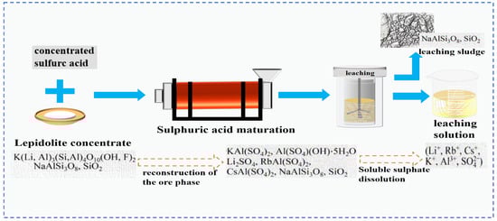 According to the type of acid selected, the acid leaching method is usually divided into the sulfuric acid leaching method and the fluorochemical method. The sulfuric acid leaching method is often combined with roasting and curing techniques, which is called the sulfuric acid roasting/curing leaching method. The sulfuric acid roasting leaching method loosens the structure of lepidolite by roasting it at high temperature. H+ in the acid replaces Li+, Rb+, Cs+ and other ions in the mineral phase lattice [17,20]. This transfers Rb and Cs to sulphates, and they are dissolved in the liquid phase during aqueous leaching. In the sulfuric acid curing leaching method, concentrated sulfuric acid undergoes a curing reaction with lepidolite ore at a relatively low temperature, and then Rb and Cs are extracted through water leaching.