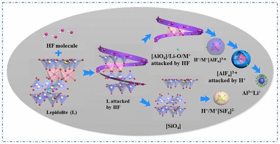 Guo [21] used a mixed solution of HF and H2SO4 to leach lepidolite and conducted a fundamental theoretical study on the mineral dissolution mechanism during the reaction, as shown in Figure 8. The results show that the mixed acid has an enhanced effect on mineral dissolution, where HF mainly breaks chemical bonds while H2SO4 accelerates the dissolution reaction and influences the coordination equilibrium between Al3+ and F−. The optimal process conditions were determined as follows: lepidolite is leached with HF and H2SO4 at a ratio of 1:2:3.5 at 85 °C for 3 h, which allows for the recovery of over 90% of rubidium and cesium. To reduce economic costs, Guo et al. [29] further improved the process by using a mixture of H2SiF4 and H2SO4 and adopted a continuous tubular reactor to enhance the effect of the acid leaching reaction. Leaching lepidolite concentrate with a mixture of H2SO4 and H2SiF6 achieves the recovery of 97.6% of Rb and 96.7% of Cs under low-temperature and short-time conditions. Although the Fluoride Chemical Method reduces acid concentration and demonstrates excellent recovery efficiency for rubidium and cesium, the introduction of a large amount of fluoride ions not only increases the difficulty of subsequent processes but also poses a risk of environmental pollution, thus limiting its industrial value.
