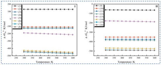 Yan [37] made improvements on the basis of the original sulfate roasting-water leaching method by reacting a mixture of sulfates and oxides with lepidolite, thereby reducing the consumption of sulfates. Lepidolite:Na2SO4:K2SO4:CaO are mixed uniformly at a mass ratio of 1:0.5:0.1:0.1, roasted at 850 °C for 0.5 h, and then subjected to a water leaching reaction at room temperature with a liquid–solid ratio of 2.5:1 for 0.5 h. Through processes such as filtration, separation, washing, and precipitation, valuable metals are recovered from the residue to the greatest extent. The reaction flow is shown in Figure 11, achieving simultaneous recovery of Rb, Cs, Li and K. Yan [38] adopted the chloride roasting-water leaching method and conducted an in-depth study on the effects of various process parameters such as roasting time and temperature of the chlorinating agent. Lepidolite was roasted with NaCl and CaCl2 at a mass ratio of 1:0.6:0.4 at 880 °C for 30 min, followed by a water leaching reaction at 60 °C for 30 min. The leaching rates of Rb and Cs reached 93.6% and 93.01%, respectively. This process is simple and achieves the advantages of simultaneous leaching of Li, Rb and Cs with high leaching efficiency and less waste residue. Wang [39] conducted an in-depth study on the mixed salt roasting-water leaching method and used a mixture of sulfates and chlorides. The mechanism of the roasting process was calculated and analyzed using the HSC thermodynamic model as shown in Figure 12, to explore the influence of the roasting process on the water leaching process. It was determined that a mixed salt of Na2SO4 and CaCl2 was used as the reaction agent for roasting with the mineral. Thermodynamic analysis shows that Na2SO4 cannot directly interact with (Li, Rb and Cs) oxides. Instead, SiO2 and Al2O3 initiate highly chemically selective ion exchange between Li+, Rb+ and Cs+ in the ore and Na+ in Na2SO4 and Ca2+ in CaCl2, achieving simultaneous extraction of Li, Rb, Cs, Na and K from lepidolite.