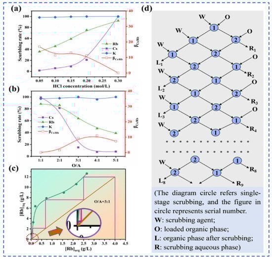 Influence of process conditions on extraction rate of Rb+ and Cs+ (a,b), (c) Scrubbing isotherm and multi-stage washing scheme (d) [49].