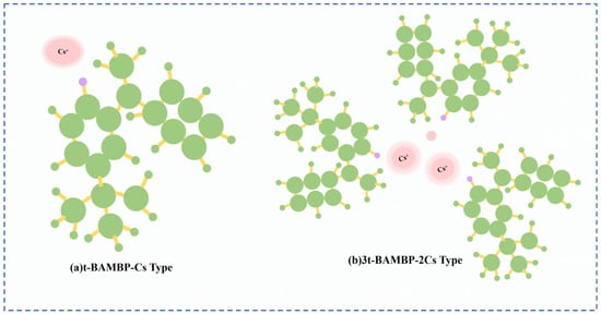 Lv et al. [49] used t-BAMBP as an extraction agent to extract rubidium and cesium resources from lithium extraction mother liquor, and conducted a systematic study on the process conditions. Finally, the optimal process conditions were determined as follows: contacting t-BAMBP with a concentration of 1 mol/L with the feed solution having an alkalinity of 10 g/L at a phase ratio of 1:4 for a contact reaction time of 1 min. Multistage countercurrent washing of the organic phase was carried out as shown in Figure 13. Under this condition, 99% of Cs in the organic phase was stripped by acid, while the washing efficiency of Rb reached 99.83%. However, due to the high consumption of reagents in this process leading to excessively high costs, Zhu [50] adopted an extraction system of t-BAMBP + sulfonated kerosene + cyclohexane, and analyze the stability of rubidium and cesium extraction processes in low-concentration lithium solutions by incorporating thermodynamic principles. A molecular cluster model was established to analyze the molecular morphology during the reaction process. Rubidium and cesium form stable 3t-BAMBP-2Cs-type molecular clusters with t-BAMBP, ensuring the stable presence of rubidium and cesium in the organic phase, as shown in Figure 14. Under optimal reaction conditions of a temperature of 25 °C, a pH of 12.5, an extraction phase ratio of 1:1 and a contact reaction time of 5 min, the extraction rate of Cs reached 99.52%, and the stripping rate of Rb reached 96.69% when the lithium extraction mother liquor was reacted with 0.5 mol/L extractant. Zhang [51] studied the recovery of cesium resources from the leachate of lepidolite after the sulfuric acid roasting process, and adopted a new process of crystallization–roasting–dissolution–solvent extraction to extract cesium from the leachate. When the temperature of the leachate is lowered, rubidium and cesium precipitate in the form of mixed alum. The mixed alum is decomposed into Cs2SO4 and Rb2SO4 by calcination at 900 °C. During the water dissolution reaction, rubidium and cesium are transferred into a mixed sulfate solution, which is then subjected to contact extraction with t-BAMBP. After washing, stripping, evaporation and crystallization, cesium sulfate is recovered with a purity as high as 98.47 wt%.