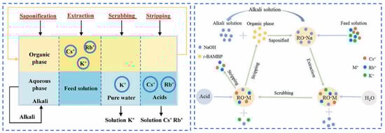 Due to the extremely high consumption of traditional solvent extraction methods leading to excessive costs, Cheng [52] considered environmental and economic impacts and proposed a synergistic system of two extractants (t-BAMBP-D2EHPA) for the extraction and recovery of Cs resources from salt lake brine. The coexisting ions (K+, Li+, Mg2+ and Na+) in salt lake brine significantly inhibit the extraction efficiency of Cs+, as shown in Figure 15. In the synergistic system, the ion extraction sequence is dominated by t-BAMBP, which preferentially extracts Rb+ and Cs+. Using a three-stage countercurrent extraction process, the extraction efficiency of Cs+ reaches 92.6%. During the extraction and stripping processes with t-BAMBP, inevitable large consumption of acids and bases occurs. In response, Dengke Pang [53] conducted in-depth research on the extraction mechanism of t-BAMBP and proposed a process using saponification, extraction, scrubbing, and stripping to recover rubidium and cesium resources from brine. Saponification reaction is carried out on the organic phase, where the phenolic hydroxyl groups in the extractant serve as binding sites for alkali metal ions. The hydrogen in the phenolic hydroxyl groups dissociates from t-BAMBP, promoting the preliminary extraction of Cs+ and Rb+. During the further extraction process, Cs+ and Rb+ form a complex MOR·3ROH (M = Cs+, Rb+, K+) in the organic phase. Under the washing and stripping processes, the MOR·3ROH complex dissociates in an acidic environment, enabling the separation of Cs+ and Rb+ from the mixed phase. After the reaction, protons (H+) in the solution bond with the phenolic hydroxyl groups, as shown in Figure 16. This regenerates the extraction capability of the t-BAMBP extractant, enabling its cyclic reuse and significantly reducing the environmental pollution caused by the extractant.