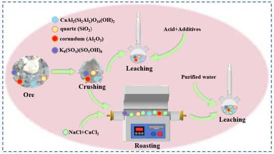 Zhang [34] adopted the sulfate roasting-water leaching method, mixing ferric sulfate with lepidolite, in which both gas–solid and liquid–solid reactions simultaneously occur in the reaction system. The cyclic phase transition process of pyrosulfate and sulfate achieves the alternating activation effect of the two salts on lepidolite, where the low-melting-point pyrosulfate significantly promotes the decomposition reaction of lepidolite. Through exploration of the process conditions, the optimal process conditions were finally determined as follows: the mass ratio of ferric sulfate to lepidolite is 2:1, roasting at 675 °C for 90 min, ultimately achieving simultaneous extraction of Rb, Cs and Li. During high-temperature roasting, lepidolite is prone to sintering into blocks. To address this phenomenon, Guo et al. [35] adopted a mixed sulfates roasting-leaching method. Potassium sulfate, calcium sulfate and barium sulfate mixed salts are used to roast with lepidolite at 900 °C for 1 h. After roasting, the minerals are leached with dilute hydrochloric acid for 1 h. The leaching rate of lithium resources exceeds 90%, but the leaching rates of rubidium and cesium are low. Therefore, Guo [36] made improvements under these experimental conditions by replacing part of the calcium sulfate with barium sulfate and optimizing the ratio between the ore and the sulfuric acid mixed salt. Under the same experimental conditions, the improvement of the reagent has significantly increased the leaching rate of rubidium and cesium. This process achieves leaching under mild experimental conditions and reduces reagent consumption compared to traditional sulphate methods, thereby more effectively reducing environmental pollution hazards. This represents a certain progressive significance compared to the traditional sulfuric acid method.