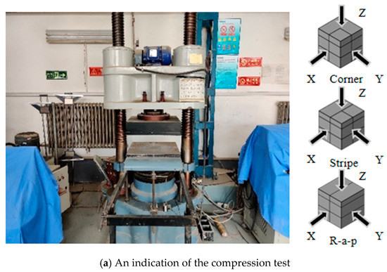 A 2000 kN electro-servo compression testing machine was employed to apply quasi-static loading to the composite 3D-printed concrete specimens. Testing was conducted in accordance with references [24,25] at a constant loading rate of 0.002 m/s2. Following the sectioning of each plate specimen, three types of test coupons were obtained, Corner, Stripe, and R-a-p, as illustrated in Figure 2. In this test, three types of specimens were prepared: Corner cubes were cut from the four corners of the sheet. Stripe cubes were obtained from the side edge of the plate (strip-shaped region). R-a-p (Radial Position) cubes were taken from the mid-section of the plate (radial direction region). For each specimen type, the 28-day compressive strength and splitting tensile strength were measured on 50 mm side length cubes. Testing was conducted along three orthogonal directions for each specimen type, as illustrated in Figure 3. Five parallel specimens were tested for each combination of specimen type and test (compressive or tensile). To investigate the failure mechanisms under different compressive and splitting tensile loading directions, the interfaces were categorized into two types based on their relationship to the printing process: interlayer interfaces and inter-bead interfaces: