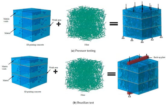 However, the core challenge of 3DPC is its inherent anisotropic mechanical behavior, which originates from the layer-by-layer deposition process during printing [10,11]. The interlayer interface region typically constitutes a weak zone, resulting in significantly lower tensile strength, shear strength, and overall structural integrity compared to traditional cast-in-place concrete [12,13,14]. Studies have demonstrated that microstructural defects at the interface, such as pores and inadequate hydration, constitute the primary factor governing crack initiation and propagation [15]. To address this performance limitation, material modification strategies are being actively pursued. These include the incorporation of basalt fiber (BF), leveraging its high tensile strength, corrosion resistance, and excellent matrix compatibility [16]. Xiao et al. [17] demonstrated that basalt fiber (BF) can enhance compressive strength along specific directions (e.g., the X-direction) by 15–20%. However, strength improvement in the vertical direction (Z-direction) remains constrained by fiber distribution limitations. Furthermore, as a critical manufacturing process parameter, the printing path exerts a predominant influence on the mechanical properties of the final component. Different printing paths, such as the commonly used strip path and contour path (or loop path), result in distinct interfacial morphologies and distributions [18]. Experiments by Le et al. [19] demonstrated significant mechanical anisotropy in specimens formed using the strip path. Specifically, the strength parallel to the printing direction (X-direction) was the highest, while the strength perpendicular to the strip direction (Y-direction) and the interlayer direction (Z-direction) were comparable but low. The numerical investigation by Xiao et al. [17] further established that interfacial slip between adjacent printed strips constitutes the primary mechanism responsible for the reduced strength of 3DPC compared to cast-in-place concrete. Regarding numerical simulation, Bi et al. [20] developed a topology optimization framework accounting for anisotropy; however, their work did not validate the framework for hybrid path designs. Furthermore, Liu et al. [21] elucidated the influence of pores on mechanical properties through CT scanning and simulation. Nevertheless, they did not comprehensively investigate the complex coupling effects among printing path spacing, fiber orientation, and pore distribution. This limitation constrains the model’s predictive capability under complex conditions.