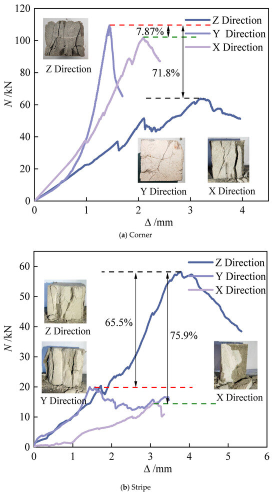 Stripe specimens demonstrate significantly enhanced Z-direction performance, indicating that strategic deposition path designs can reconfigure mechanical advantages through controlled material stacking patterns. All specimen types exhibit consistent load–displacement behavior across loading directions (Figure 6): rapid initial displacement progression, moderated mid-stage deformation, and terminal brittle fracture.