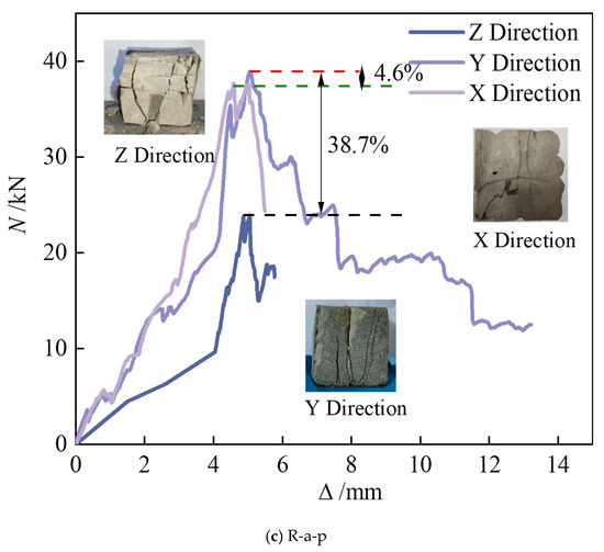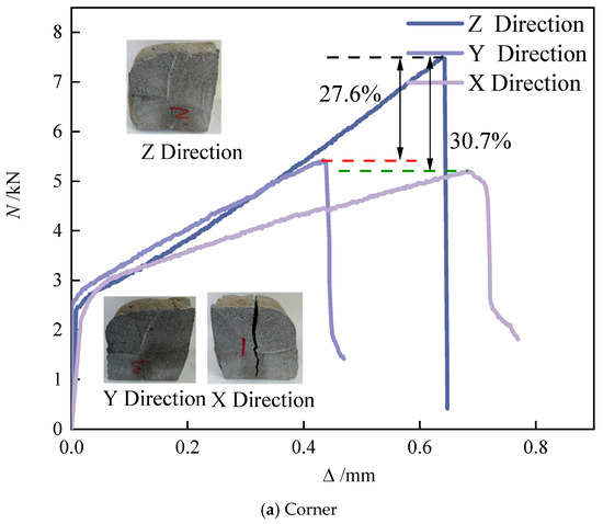 As shown in Figure 8, all three splitting tensile load–displacement curves exhibit similar behavioral trends: an initially linear elastic response followed by abrupt post-peak softening after reaching maximum load. This indicates brittle fracture at critical loading, with failure planes propagating completely through the specimen core. Significant variations in load-bearing behaviors exist between specimen types. Among the specimens, Corner specimens exhibit the highest Z-direction load capacity with minimal displacement range, indicating rapid stress-concentrated failure along the principal loading axis. Stripe specimens demonstrate superior X-direction bearing capacity, with significantly enhanced displacement ductility compared to Corner specimens, suggesting that internal structural mechanisms (fiber pull-out or interface debonding) prolong failure progression. R-a-p specimens show 4.3% and 24.3% reductions in Y- and Z-direction capacities relative to the X-orientation, respectively. With maximum displacement limited to 0.38 mm—the lowest ductility among specimen types—R-a-p’s failure mode exhibits complex asymmetric fracture propagation attributed to multiaxial stress interactions. These performance variations originate from fundamental differences in printed geometry, material anisotropy, and loading directionality, demonstrating the structural design’s significant influence on splitting tensile behavior.
