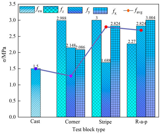Compressive strength variations exist across printed specimen types. Corner specimens exhibit the highest Y-direction strength (fy = 43.6 MPa), exceeding Stripe’s fz and R-a-p’s fy by 46.78% and 64.2%, respectively. Their tri-directional mean strength (36.8 MPa) also demonstrates superiority, surpassing Stripe and R-a-p specimens by 66.6% and 64.1%, respectively. This enhancement stems from the confinement effect: Initially printed perimeter concrete radially constrains subsequently deposited material, improving compaction in striped regions. Conversely, R-a-p specimens yield the lowest mean strength due to extensive weak interfacial transition zones formed during layer-by-layer deposition. Notably, X- and Y-direction strengths remain comparable across all specimen types, which is attributable to identical interfacial bonding characteristics on these loading planes.