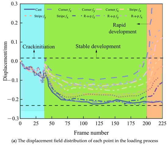 When the 3D-printed concrete cube specimen was loaded along the x-direction, cracks propagated roughly along a 45-degree diagonal plane, ultimately leading to rupture. The displacement at measurement points initially exhibited a fluctuating increase, followed by a stabilization period and then a continued rising trend.