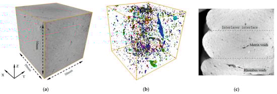Industrial X-ray computed tomography (CT) scanning was performed using a multi-scale voxel system. Following 28 days of curing, Corner specimens (50 mm cubes) were scanned at an isotropic voxel resolution of 102.713 μm. The scanning parameters utilized a 450 kV X-ray source with current settings of 1.60 mA and 3.30 mA. Each specimen was reconstructed from 1000 radiographic projections, yielding a 3072 × 3072 pixel matrix covering a 427 mm × 427 mm field of view. Data denoising was performed using a median filter. To ensure data validity, slice images corresponding to the axial extremities of the cubical specimen were cropped. Following 28-day curing, CT-scanned data underwent preliminary reconstruction using VoxelStudioRecon 3D image reconstruction software (version 2.1.0, Thermo Fisher Scientific, Waltham, MA, USA) to generate initial tomographic projections [27]. Subsequently, Avizo software(version 9.5.0, Thermo Fisher Scientific, Waltham, MA, USA) was employed for data preprocessing to quantify microstructural parameters, including the porosity, pore size distribution, pore volume, pore morphology, and centroid coordinates of pores.