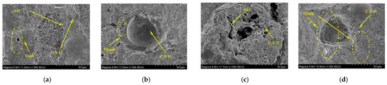SEM diagram of 3D-printed concrete: (a) 3D-printed concrete crystal precipitation zone’s SEM diagram; (b) SEM image of the C-S-H enrichment zone of 3D-printed concrete; (c) 3D-printed coagulation pore area SEM diagram; (d) SEM images of the 3D-printed concrete interface area.