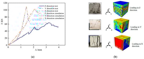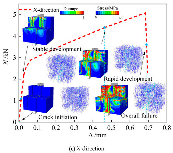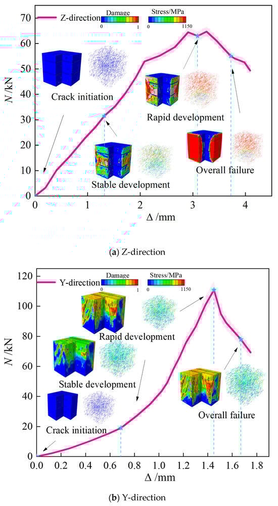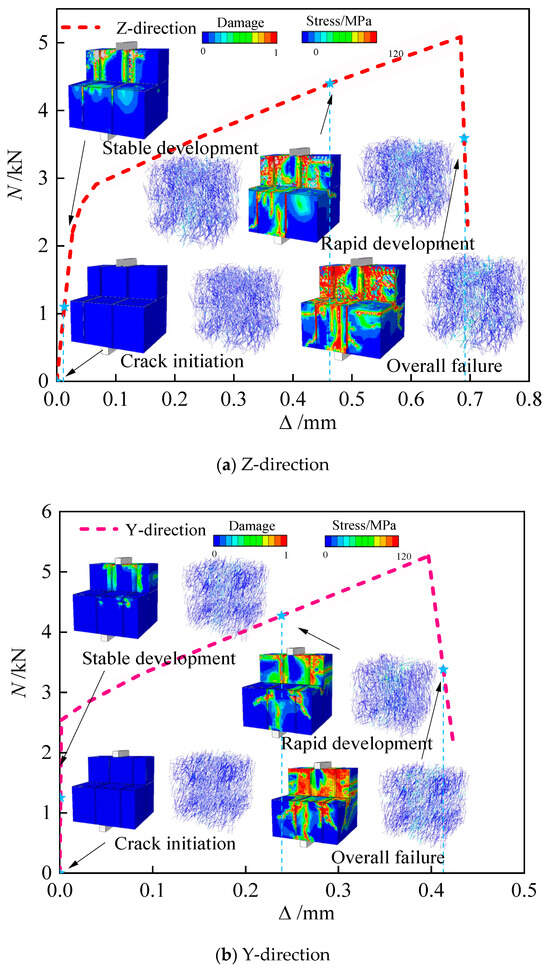 To further interpret the damage mechanisms, it is important to highlight both the concordances and discrepancies between experimental observations and simulation results. In the compression tests, for example, cracks in the X-direction primarily propagate along filament interfaces, while Y- and Z-direction cracks typically follow interlayer planes—consistent with the inherent anisotropic structure of 3D-printed materials. In simulations, these failure paths were effectively replicated by incorporating anisotropic weakening at the filament and interlayer interfaces, demonstrating strong agreement.