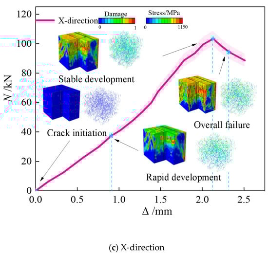 As shown in Figure 18c, the specimens exhibit optimal mechanical performance along the filament alignment direction (X-axis), demonstrating high synergy between fiber reinforcement and printing path. Elastic Stage: Stress distributes uniformly along continuous filaments. X-aligned fibers significantly enhance matrix stiffness, increasing elastic modulus by 15–20% compared to other orientations. Interfacial shear stresses remain negligible. Elastoplastic Stage: Matrix microcracks are constrained by fiber bridging, resulting in tortuous, bifurcated propagation paths. Fiber–matrix mechanical interlocking delays interfacial slip, causing multi-stage stiffness degradation. Plastic Stage: Failure couples matrix crushing with interfacial slip. Fiber pull-out energy dissipation mechanisms increase residual strength by >30%, producing a characteristic multi-stage softening plateau.
