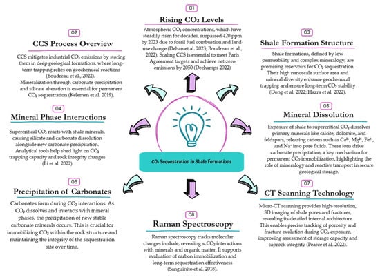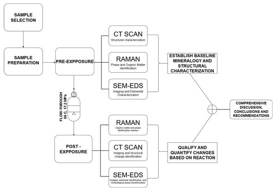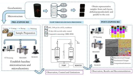 Previous studies have frequently incorporated brine or gas impurities, making it difficult to isolate the effects of CO2 alone. Mineral transformations occur in shales under scCO2–SO2 conditions [8], but the independent behavior of shale minerals in the presence of pure scCO2 remains poorly understood. Moreover, comparative data on reservoir and caprock lithofacies from the same shale formation under identical conditions are limited. Figure 1 illustrates the various study gaps and our comprehensive experimental ideology.