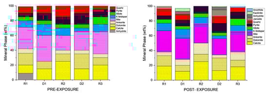 - Albite (NaAlSi3O8). Albite was present in every sample, and its presence in R1 had minimal increase from 4.88 to 5.75 wt.% and in R3 it was a negligible change from 5.96 wt.% preexposure to 5.94 wt.% post-exposure. In D1 and D2, albite changed from 4.71 wt.% and 4.82 wt.% to 4.93 wt.% and 4.65 wt.%, respectively, all of which are within experimental error limits due to sample heterogeneity. Grains retained sharp outlines and showed no signs of dissolution.