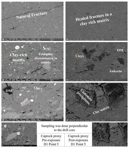 D1 Caprock proxy pre and post exposure. SEM images of D1A–Point 5 (caprock proxy) before (left) and after (right) scCO2 exposure, showing textural and mineralogical changes. Pre-exposure images reveal a fine-grained, clay-rich matrix with disseminated feldspars. Post-exposure, the caprock surface shows enhanced expression of clays and feldspars, alongside preserved organic matter and ankerite. The increased concentration of clays suggests mineral stabilization and enrichment, reinforcing the caprock’s sealing capacity and long-term geochemical integrity following scCO2 injection.