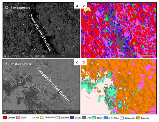 Mineral phase maps and backscattered SEM images from R3 illustrating carbonate phase evolution before and after scCO2 exposure. In the pre-exposure image (a), a naturally filled fracture is observed cutting through the matrix, with the corresponding EDS phase map (b) showing ankerite and calcite phases localized along the fracture and at feldspar–carbonate interfaces. Post-exposure imaging (c) reveals a completely sealed fracture, consistent with carbonate re-precipitation and in situ sealing. The post-exposure phase map (d) highlights redistribution and partial reduction of carbonate phases, with transformation at mineral boundaries and localized infill zones dominated by fine-grained reaction products. This supports evidence for carbonate re-precipitation and sealing under dry scCO2 conditions.
