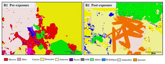 Post-exposure mineral map shows newly formed jarosite in reservoir facies with adjacent porosity development, suggesting sulfate phase persistence under localized oxidative conditions.