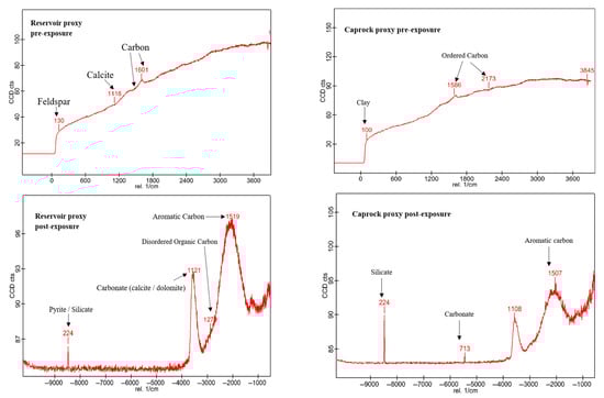 Raman spectra of reservoir (R1) and caprock (D2) facies before and after exposure to scCO2 at 60 °C and 17.8 MPa. In the reservoir proxy (R1), carbon signals evolve from a broad disordered peak (~1601 cm−1) to distinct D and G bands at 1279 cm−1 (disordered/sp3 carbon) and 1519 cm−1 (aromatic/sp2 carbon), indicating increased structural ordering and aromatization. In the caprock proxy (D2), a similar transformation is observed, with the pre-exposure band at 1586 cm−1 shifting to a more defined aromatic signal at 1507 cm−1 post-exposure. Peaks associated with carbonate (~1108–1121 cm−1), silicate (~224 cm−1), and clay (~100–130 cm−1) are also present. These spectra confirm the retention and transformation of organic matter toward more graphitized forms under scCO2 conditions.