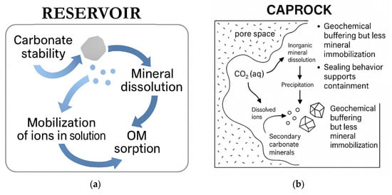 Shale exhibits dual-functionality for CO2 storage governed by facies-specific geochemical behavior. (a) The reservoir acts as a reactive matrix, promoting mineral dissolution, elemental redistribution, and stable secondary phase precipitation essential for geochemical trapping. (b) The caprock maintains low reactivity, enabling structural preservation through limited transformation and clay-stabilization, thereby supporting long-term seal integrity.