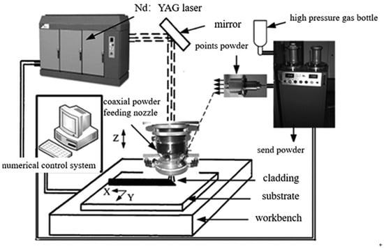 Additive manufacturing (AM) refers to a low-loss laminated processing technology that utilizes computer software to establish a three-dimensional model of a component and processes and shapes discrete materials (such as powder, liquid, wire, etc.) through a specific printing technique via layer-by-layer melting and accumulation [1,2]. Additive manufacturing technology has advantages such as a high overall material utilization rate, few processes, high design freedom, the ability to manufacture complex-structured parts, easy realization of intelligence, and high efficiency. It has been widely applied in fields such as aerospace, automotive manufacturing, petrochemicals, metallurgy, and railway locomotives [3]. Laser additive manufacturing technology, as one type of additive manufacturing technology, not only can enhance the wear resistance, corrosion resistance, and thermal stability of mechanical parts, but also has significant advantages such as high efficiency, rapidity, and suitability for processing complex parts. It is more suitable for manufacturing components with complex geometries, high flexibility, and high automation [4,5].