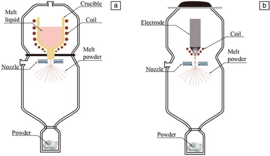 Gas atomization pulverization technology originated in the 1820s and was initially used for the preparation of non-ferrous metal powder. In the late 1970s and early 1980s, computer technology and modern control technology were integrated into the industrial production of gas atomization pulverization, leading to significant advancements in the research on the mechanism of gas atomization [20]. The principle of gas atomization pulverization technology involves converting the kinetic energy of the gas into the surface energy of the melt by acting on the melt flow with high-speed air flow and then forming fine droplets that are solidified into powder particles. Currently, typical gas atomization technologies are vacuum induction melting gas atomization (VIGA) [21] and electrode induction melting gas atomization (EIGA) [22]. Vacuum induction melting gas atomization technology completes the melting and degassing process of alloy raw materials in the crucible under vacuum conditions, and then the molten metal flows through the diversion tube to form a stable liquid column. The liquid flow meets the high-pressure gas under the control of the nozzle and is broken into fine metal droplets. The molten metal droplets are constantly cooled and spheroidized by high-speed high-pressure gas in the atomization chamber. Finally, they solidify into a spherical powder [23], as shown in Figure 2a. Electrode induction argon atomization is an improvement over vacuum induction melting gas atomization. The technology uses the shaped alloy rod material as the electrode, and the alloy rod is heated and melted through the high-frequency induction coil in the vacuum chamber to form a continuous and controllable molten metal flow with a fixed diameter. The alloy liquid flow flows into the atomization chamber under the action of gravity (no diversion tube). Metal droplets are atomized into metal droplets in contact with high-pressure air flow, and then the droplets complete the process of cooling, spheroidization, and solidification in the atomization chamber and finally solidify into spherical powder [24], as shown in Figure 2b.