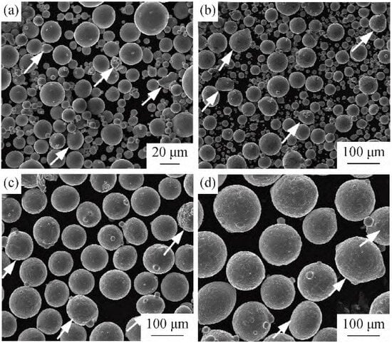 SEM surface morphology of TiAl alloy powders in different particle size intervals: (a) ≤45 μm, (b) 45~75 μm, (c) 75~100 μm, (d) ≥100 μm. Reprinted from Ref. [27].