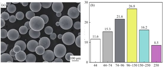 In the process of PREP powder, the composition of the parent material plays a decisive role in the composition of the powder prepared finally and ultimately affects the performance of the product. In the process of melting the parent, precise chemical composition control is essential. Tang Huiping [34] discovered that the pores in the plasma rotating electrode powder were caused by low surface tension, making it easier to produce pore defects within coarse-particle-size powder, that porosity and other defects can significantly reduce the material’s density and mechanical strength, and that when the component is subjected to external force, stress concentration occurs around porosity, resulting in local stresses far higher than the average stress level. When the porosity rate in metal components reaches a certain level, their tensile strength and yield strength may be reduced by 20–50%, and the toughness will also decrease significantly. Yang Xin [35] utilized the plasma beam rotating electrode method to produce Ti-47Al-2Cr-2Nb spherical powder with a particle size distribution ranging from 30 to 250 μm, an average particle size (d50) of 85 μm, a bulk density of 2.65 g/cm3, a sphericity rate of 99.6%, and an average oxygen content of 0.05%. As the powder particle size decreased, the oxygen content increased sharply but did not surpass 0.10%. Xie Zhonghao [36] prepared high-sphericality, low-oxygen-content TaNbTiZr refractory high-entropy alloy powder using the PREP method, resulting in good compositional uniformity and a low impurity content, with the oxygen mass fraction of only 0.0777%; the high-quality spherical powder of TaNbTiZr refractory high-entropy alloy prepared by the plasma rotating electrode atomization method (PREP) was used as a raw material, and the structure and mechanical properties of TaNbTiZr refractory high-entropy alloy prepared by electron beam selective melting (EBM) were investigated. The results show that the NbTiZr refractory high-entropy alloy shows a fine equiaxed grain structure and has excellent mechanical properties [37]. Li Zengfeng [38] employed the plasma rotating electrode atomization technique to prepare spherical Ti185 alloy powder. The resulting alloy powder was entirely composed of the β phase, with particles exhibiting high sphericity and a lack of irregular or satellite powder. The powder particle size distribution was broad, primarily between 44 and 150 μm, with a maximum size reaching 250 μm. The microstructure and particle size distribution of the Ti185 alloy powder are depicted in Figure 5. The results indicated that the oxygen content (mass fraction) of the powder was under 0.14%. Powder with a particle size ≤ 44 μm had a smooth surface, and its internal structure was notably refined, with a powder recovery rate of 11.6%. The fluidity of powder ≤ 150 μm was 24.79 s/50 g, the bulk density was 2.79 g/cm3, and the vibration density was 2.99 g/cm3, meeting the requirements for powder bed 3D printing technology.