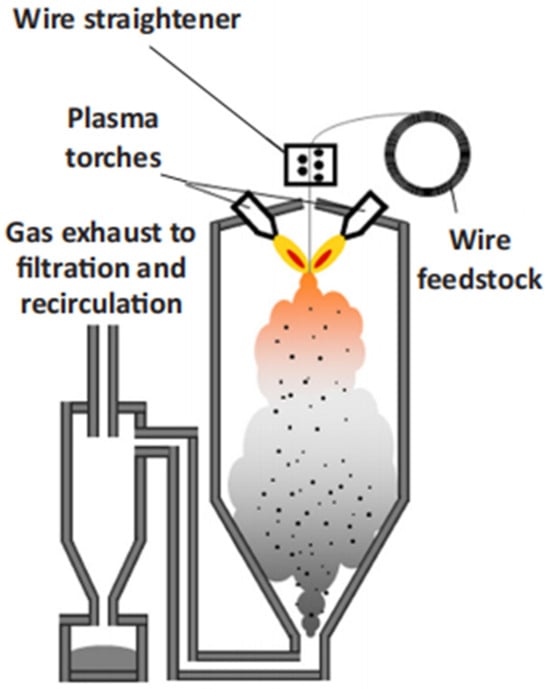 Plasma atomization (PA) is a method that uses a plasma torch as a heat source to heat and melt metal wire and simultaneously atomize it to prepare spherical metal powder [40]. The technical principle is to introduce inert gas such as argon into the plasma region; the raw material wire is heated and melted by multiple groups of plasma arcs, and the high power supply generates a high frequency electromagnetic field, which ionizes the gas to form a plasma jet. When the metal self-consuming rod acts as an anode and interacts with the plasma jet, the metal is heated and melted rapidly. Under the impact of the plasma jet, it is broken into a large number of tiny droplets and dispersed at a very fast speed. Under the action of surface tension, it is cooled and solidified into spherical powder [21,41], as shown in Figure 6.