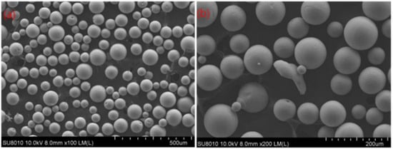 Microscopic morphology of spherical titanium powder prepared by plasma atomization technology; (a) 100 times, (b) 200 times. Reprinted from Ref. [43].