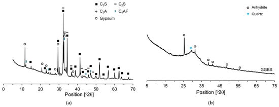 In this research, a cement with no supplementary cementitious materials such as FA or GGBS was used as the binder, referred to as research cement (RC). RC was produced by mixing desulfurized gypsum (5%) with clinker (95%) and then crushing the mixture []. RC used more reliable results when analyzing the cement microstructure. Table 1 presents the chemical compositions of the raw materials and their respective loss-on-ignition (LOI) values. The main mineral components of the RC were identified by XRD (Figure 1a) as C3S, C2S, C3A, C4AF, and gypsum, and Rietveld refinement of the XRD pattern yielded fractions of 61.8, 10.6, 11.3, 8.6, and 7.7 wt%, respectively. The main mineral components of the GGBS were anhydrite and quartz. Most of the GGBS is amorphous, with small amounts of crystalline phases, namely, anhydrite (2.9%) and quartz (2.1%). The densities of RC and GGBS are 3.18 g/cm3 and 2.91 g/cm3, respectively, and their Blaine fineness values are 3870 cm2/g and 4200 cm2/g. The particle size distribution characteristics of RC and GGBS are illustrated in detail in Figure 2, providing a comprehensive depiction of the range and proportion of particle sizes present in each material. C-S-H nanoparticles, used as a hardening accelerator, were synthesized using sodium metasilicate (Na2SiO3∙5H2O), calcium nitrate tetrahydrate (Ca(NO3)2∙4H2O) powder, and a polycarboxylate based dispersant (50 wt% solid content).