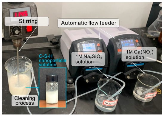 C-S-H nanoparticles synthesized in the authors’ previous research were used []. The synthesis of C-S-H nanoparticle was carried out at room temperature using reagent-class Na2SiO3∙5H2O and Ca(NO3)2∙4H2O powders. Figure 3 illustrates an overview of the C-S-H nanoparticle synthesis process. First, 60 g of distilled water was mixed with 22.34 g of the polycarboxylate superplasticizer in a beaker, and the mixture was stirred using an agitator. The content of the polycarboxylate superplasticizer was used to adjust the crystal size of the C-S-H nanoparticles []. The reagent-class Na2SiO3∙5H2O and Ca(NO3)2∙4H2O powders were added to 180 g and 90 g of distilled water, respectively, to achieve a molar concentration ratio of 1:1. Thereafter, automatic flow feeders were fixed to the beaker to supply rates of 4.6 and 2.9 mL/min of Na2SiO3 and Ca(NO3)2 solutions, respectively, under stirring at a speed of at least 1000 rpm. During this synthesis, Na+ and NO3− are generated as impurities, in addition to the C-S-H nanoparticles. These components must be considered because they reduce the durability of concrete via alkali–aggregate reactions that produce NaNO3 [,]. In this study, centrifugal separation was performed at a speed of ~4500 rpm to remove the impurities generated. The supernatant containing the impurities was removed by rinsing the precipitate with distilled water. This process was repeated three times to produce C-S-H nanoparticles as an opaque white gel with a solid content of ~21% (Figure 3). In this study, the particle size of the synthesized C-S-H nanoparticles ranges from 30 nm to 50 nm.