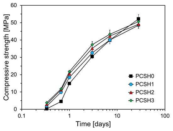 Compressive strength development over time of PCSH samples with different C-S-H nanoparticle contents.