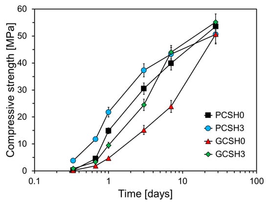 Figure 7 shows the compressive strength of the GGBS cement specimens containing C-S-H nanoparticles. The major limitation of cement composites containing GGBS is that their early-age strength is low compared to that of ordinary cement composites []. This limits the mass utilization of GGBS in the construction industry because it increases the construction time. Many studies have focused on increasing the early-age strength of cement composites containing GGBS [,,,]. As an example, Xu et al. conducted a study on the influence of nanosilica in cement composites containing high volume GGBS []. Figure 7 shows that the compressive strength of GCSH0, in which GGBS replaced 50% of the cement weight, is lower than that of PCSH0. The compressive strengths of GCSH0 at 1 d, 3 d, 7 d of age were 10.2, 15.3, and 16.0 MPa lower than that of PCSH0, respectively, however, the difference in compressive strength decreased to 2.9 MPa at 28 d. Furthermore, GCSH3 containing 3 wt% C-S-H nanoparticles exhibited an improved compressive strength, which was noticeable at 7 d of age. At 8 h, the compressive strength of GCSH3 surpassed that of PCSH0 by 0.57 MPa, however, it was 1.19, 5.4, and 6 MPa lower at 16 h, 1 d, and 3 d, respectively. This tendency was reversed after 3 d; at 7 and 28 d, the compressive strengths of GCSH3 were 4.1 and 1.6 MPa higher than that of PCSH0. GCSH3 consistently demonstrated higher compressive strength than GCSH0 at all ages, with the maximum difference of 20.1 MPa observed at 7 d. However, from 8 h to 3 d, the compressive strength of GCSH3 was 2.96–12.8 MPa lower than that of PCSH3. This is because the C-S-H nanoparticles act as additional nucleation sites, which accelerate the early hydration of the cement. As a result, an alkaline environment is rapidly established, which in turn activates the latent hydraulic properties of GGBS, leading to earlier and greater strength development [].