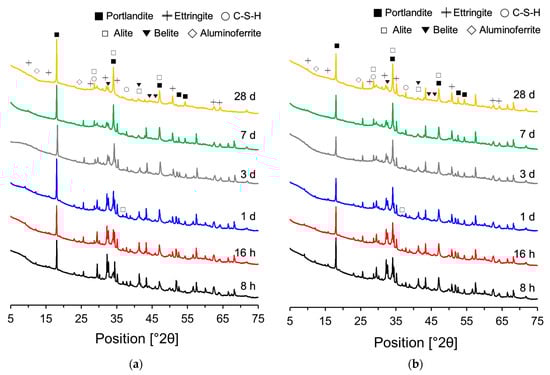 XRD patterns measured at different ages: (a) PCSH0; (b) PCSH3.